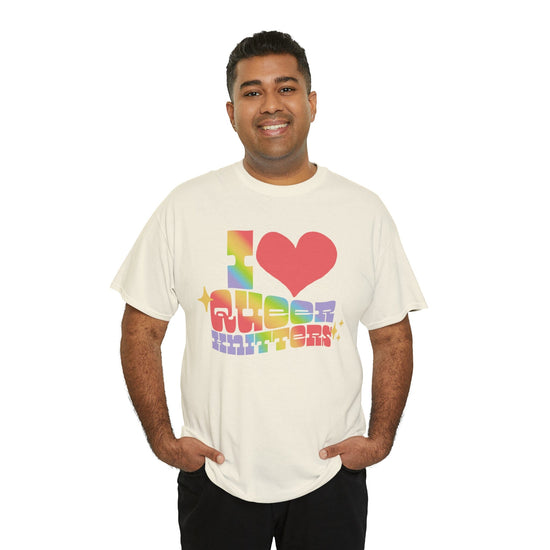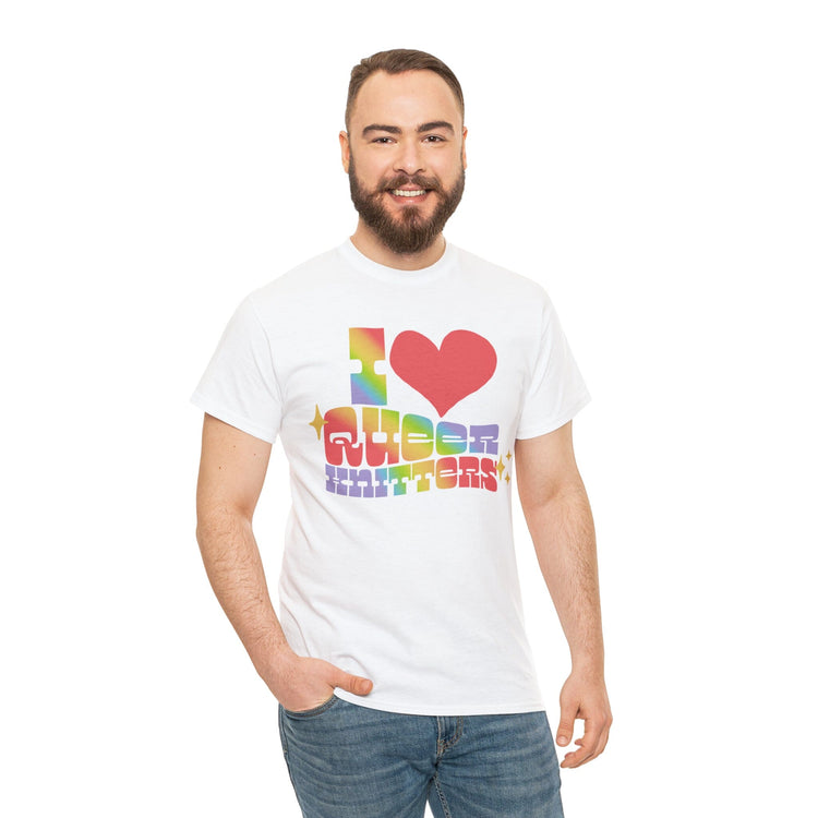 Crafted with care, this tee features a bold and eye-catching design that proudly proclaims your admiration for the artistry and creativity of queer knitters. The phrase "I <3 QUEER KNITTERS" is displayed in a playful and colorful font, representing the vibrant spirit of the knitting community and the love and acceptance it embraces.